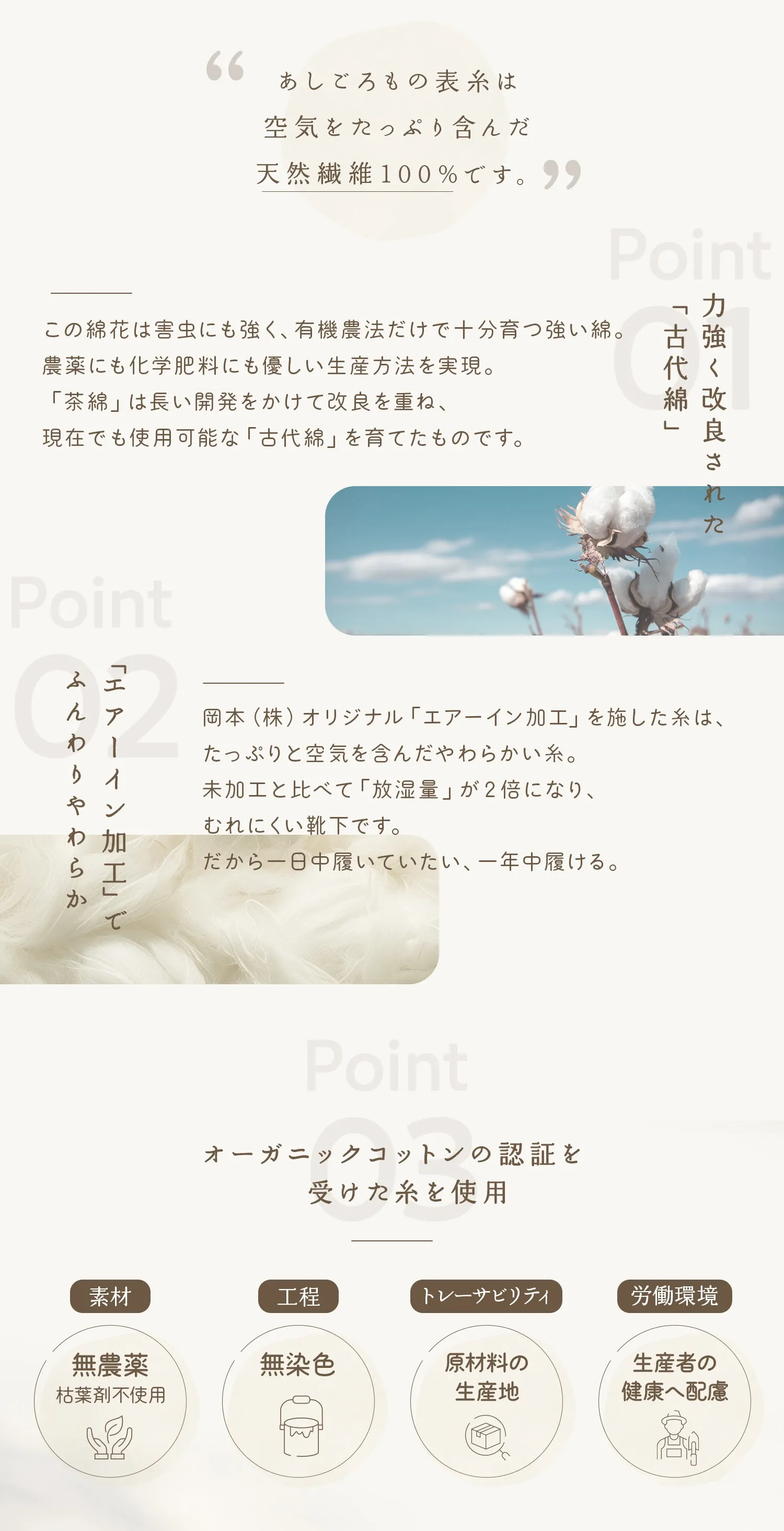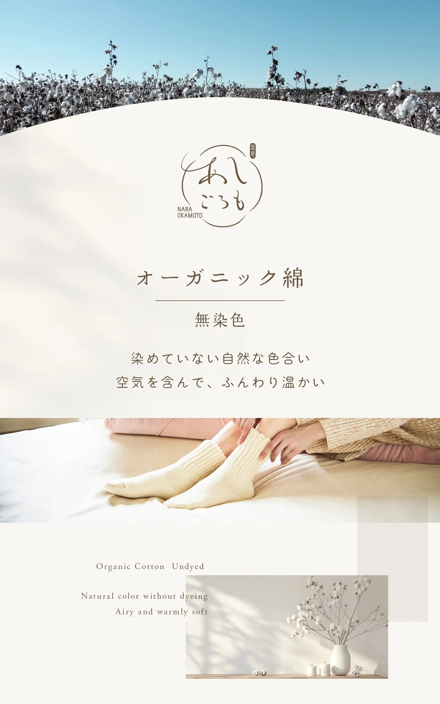 ふんわり紡いだ糸で、ふんわり編み上げ、そしてふんわりくるんであげる。「つつむ」よりもっといたわるようなやさしさ。「くるむ」という感覚。それが「あしごろも」。 明日の一歩のために、その足もとに惜しみない愛情を。