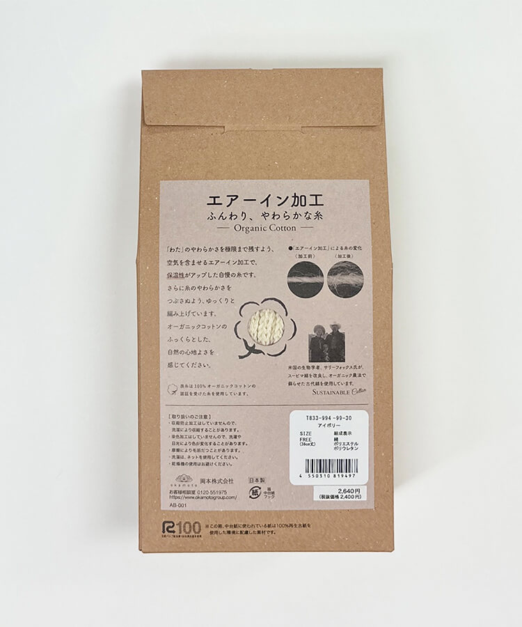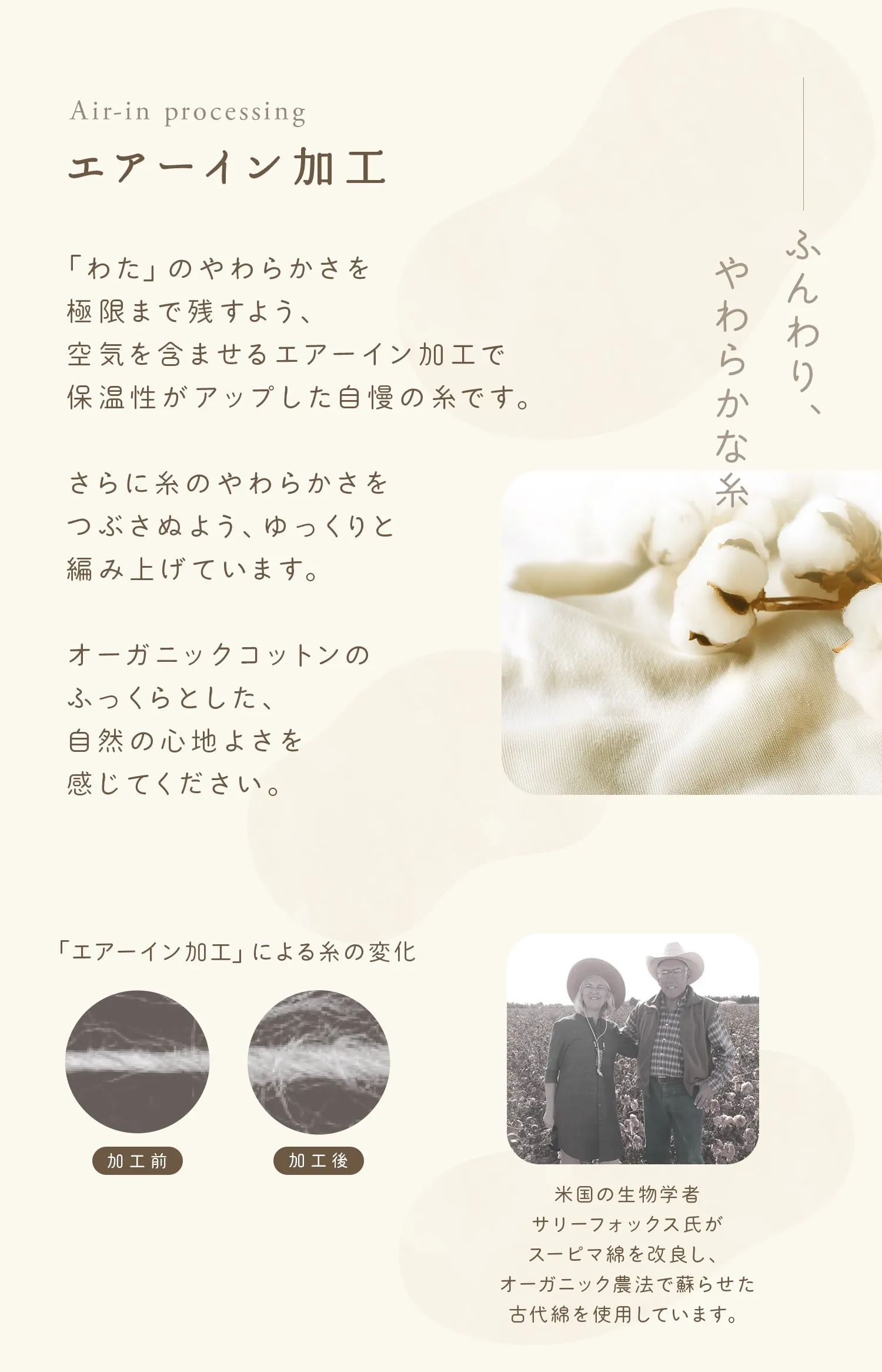 「わた」のやわらかさを極限まで残すよう、空気を含ませるエアーイン加工で保温性がアップした自慢の糸です。